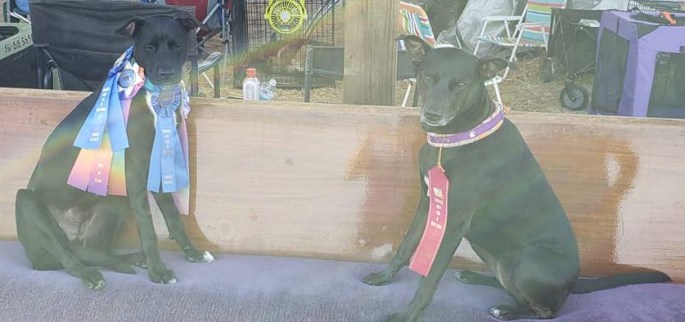 A proud Cookie showing off her barn hunt ribbons in January 2019 (before Ziggy came along).